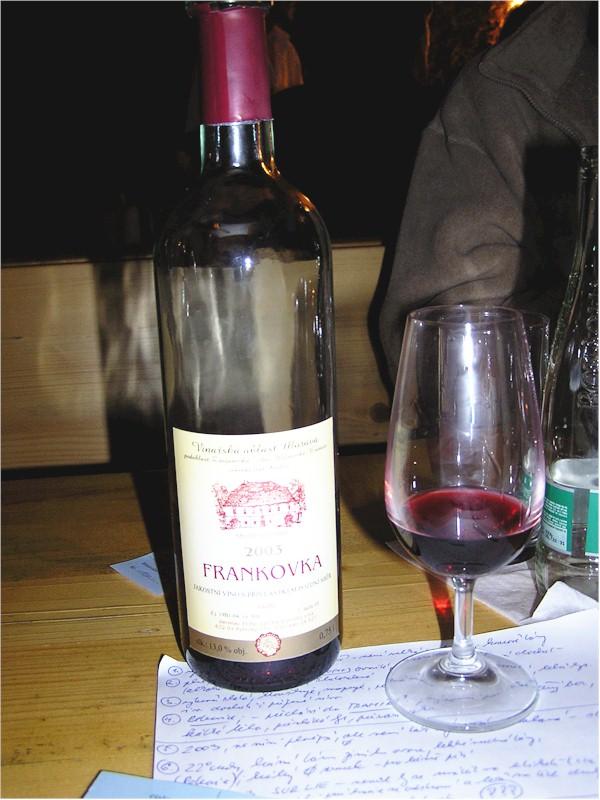 Frankovka 2003 pozdní sběr - číslo šarže 05. Hrozny byly sbírány na viniční trati Skalka v Dobelicích. Barva silná, mohutná tmavě rubínová při pohybu ve sklenici s jemnými fialovým nádechem, ve vůni i v chuti velice výrazné lesní plody, ostružiny, kořenitá s klasickými tříslovinami, které příjemně potlačily kyselinky v pozadí. Alkohol 13 %, vyrovnané víno, krásná velice dobrá Frankovka. Cena: 120,- Kč.
