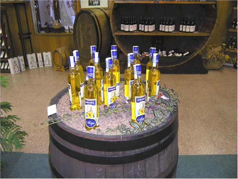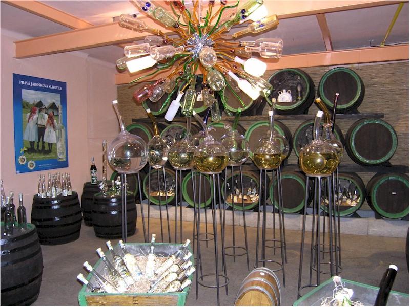 Sobotní odpoledne 19. srpna 2006 jsme strávili putováním po Mutěnické vinařské cyklostezce, kdy jsme také stačili domluvit prohlídku firmy Sklepy Jarošek v Mutěnicích. Bylo nádherné odpoledne a po chvilce odpočinku jsme se vydali na domluvenou schůzku. Jako vždy jsem přemítal v hlavě, co nás zde asi čeká? Znáte to, většinou vyhraje představa strohé prohlídky výrobních prostor. O to větší překvapení bylo z neplánovaně prodloužené návštěvy, ale nebudu předbíhat.Musím začít příchodem do areálu firmy. Nejprve vystoupáte po staré silnici, vydlážděné žulovými kostkami, ke vstupní bráně (foto č. 1), která září bílo-žlutou fasádou ozdobenou vinařskými motivy. Hned za bránou najdete starý vinařský lis (foto č. 2 a 3). Vpravo od něj je administrativní budova (foto č. 4). Pokračujeme dále na jakési nádvoří, které je na dvou stranách obklopeno velkými sudy, ve kterých můžete posedět a degustovat (foto č. 5 a 6). Na tomto místě musím vzpomenout poznámku od Petra, který v článku Na skok ve Vinařství Spielberg v Archlebově, zmiňuje čistotu a pořádek. Naprosto stejný dojem jsem měl i zde. Jaký to propastný rozdíl například po návštěvě výrobních prostor Vinařství Baloun ve Velkých Pavlovicích na místním vinobraní 2. září 2006. Reportáž připravuji na začátek prosince, kdy se dozvíte více, ale ten pohled na nepořádek a zápach mám stále před sebou. Ze všech koutů vykukovala špína, prostě známé heslo Špínu nikdy neschováš! zde platilo do slova a do písmene. V Mutěnicích to bylo zcela jiné, čistota zde byla na denním pořádku a to je jenom dobře!Vstupujeme do hlavní budovy, po levé straně najdete velkou prodejní místnost, do které se vrátíme na úplný konec. Slečna, která nás čeká v přesně dohodnutou dobu nás přivítá, zaplatím vstupné a již sedíme na lavici před projekčním plátnem. Dalších asi 15 minut sledujeme propagační DVD, dozvídáme se základní informace o firmě a její historii. Opět kvituji přístup a štábní kulturu, propagační DVD je v několika jazykových verzích! Ano, nechat si vyrobit a teké zaplatit propagační materiál není zadarmo, ale ukazuje to na civilizovanou úroveň a připravenost. Při sledování DVD mne upoutají nádherné záběry viničních tratí a říkám si, že jsme si dobře zvolili oblast pro naše putování. Marně vzpomínám, kde jsme se s podobným přístupem setkal? Zjišťuji, že nikde... Většinou vás přivítají přímo ve výrobní hale nebo v nějaké vhodné místnosti, kde se dozvíte něco o historii a vínech. Poté si prohlédnete výrobní prostory, pak sklepní a už jste na odchodu. Nemohu se ubránit dojmu, že zde formu prezentace nepodcenili. První dojem je velmi pozitivní a nabývám dojmu, že se snažili nepodcenit žádný detail, ani ten zdánlivě nepodstatný... Na DVD mne zaujala třeba pasáž o chovu koní pro prezidenta Masaryka. Současný majitel firmy, Vladislav Jarošek, pochází totiž ze starého mutěnického rodu, který za první republiky proslul chovem koní. Ty reprezentovali důstojnost našeho prvního prezidenta. Dnes Vladislav Jarošek dodává na Hrad prezidentovi Václavu Klausovi jen vybranou slivovici :-)Protože jsme se dozvěděli všechny základní informace o firmě, bude vhodné se s nimi podělit. Firma Sklepy Jarošek Mutěnice existuje v jednom celku společně s Veleckou pálenicí ve Velké nad Veličkou a Likérkou Mutěnice. Sklepy Jarošek sídlí v areálu vinařských závodů v Mutěnicích, které vznikly na začátku třicátých let minulého století. Mezi hlavní výrobní sortiment patří konzumní lihoviny, značkové ovocné destiláty, ovocné nápoje Fruiko, přívlastková, jakostní a známková vína. Pokud jste očekávali, že zmíním výrobu vína na prvním místě, jste na omylu. Výroba vína není totiž hlavní výrobní činností, ale nebudu předbíhat. Výroba lihovin a ovocných destilátů probíhá ve Velecké pálenici, která v roce 2003 oslavila již 125. výročí založení. Mezi exkluzivní řadu destilátů patří například Božská slivovice, Kosher slivovice a Williams hruškovice. Mezi další produkty patří značkové lihoviny prodávané pod vlastní ochranou známkou a ovocné destiláty, které jsou vyráběny na moderním destilačním zařízení německé firmy Arnold Holstein pod přísnou kontrolou kvalifikované obsluhy. Protože na kvalitu destilátu má největší vliv kvalita použitého ovoce, je výběru věnována největší pozornost. Slivovice zraje 2 roky než jde do prodeje.Po prohlídce prezentačního DVD konečně začíná prohlídka. Slečna nás vyzve do první místnosti (foto č. 7) a začíná s výkladem. Vysvětluje Jaroškovo desatero s ilustracemi (foto č. 8). Dále se zastaví u popisu pálenek, které se zde dělají. Stačil jsem si poznamenat, že vyrábějí grappu, slivovici, třešňovici, jalovcovici, malinovici, hruškovici, meruňkovici, broskvovici, jablkovici, jahodovici a mirabelku. V okamžiku, když se pomalu přemisťujeme kolem základních informací o pálenkách prochází kolem nás majitel Vladislav Jarošek (foto č. 9). Po krátkém seznámení se domlouváme, že se po prohlídce ještě sejdeme a pobavíme se o věcech kolem výroby vína.Pokračujeme dále až na konec místnosti, kde se nachází zajímavá expozice pálenek. Celý tento prostor byl citlivě doplněn zvláštními skleněnými tvary, které navrhoval Bořek Šípek, jak můžete vidět na fotce č. 10, 13, 14 a 15. Na fotce č. 10 vidíte originální skleněný lustr. Bořek Šípek je také autorem návrhu lahví pro vybrané pálenky. Tvar láhve připomíná ovoce, ze kterého je každá pálenka vyrobena. V dubových soudcích na fotce č. 12 můžete vidět láhve jablkovice položené na peckách z meruněk
