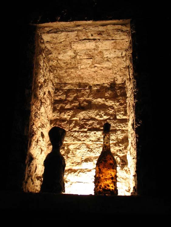 Opět vše probíhalo v pohodě a klidu. Byl jsem prvním prázdninovým návštěvníkem tohoto vinařství, denně jich tam mají tak cca kolem 6-ti, pokud nedorazí výpravy. Průvodce velmi příjemný, vstřícný. Vchod do sklepů je přímo ve výrobní budově vinařství a je chráněn nádhernými dveřmi, ručně řezanými v 19. století. V podzemí Vás hned na začátku katakomb uvítají malé prosvětlené výklenky (foto dole), kde zvláště v jednom je specifická láhev. Jedná se o láhev z roku (tuším to bylo) 1856, kterou, jestli jsem správně postřehl tuto část z výkladu, vinařství dostalo při svém založení. Dále v levé části sklepa jsou soukromé sbírky vlastníků vinařství, na jejímž konci odpočívají mé vytoužené esence (foto dole). Stále je mám tak blízko na dosah a přeci tak daleko. Nedaří se zatím nikoho ukecat na ochutnávku. Holt to bude ten problém mamutích vinařství. Průvodci tam mají nejmenší pravomoce, to není jako s majitelem, manažerem, ekonomem a skladníkem v jedné osobě. I když jednu zlatou výjimku jsem zažil, o té ale až v posledním příspěvku. A co že to tam bylo k ochutnání?