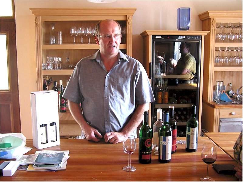Další zastávkou našeho podzimního putování za vínem bylo vinařské městečko Neusiedl am See ležící na severním konci jezera a vinařství Weingut Paul Koppitsch. S panem Koppitschem jsme ale nejprve zajeli do vinohradu. Společně se svojí ženou a dcerami obhospodařuje 12 ha a z dalších 3 ha vykupuje smluvně hrozny. Pěstuje širokou škálu odrůd, z bílých hlavně Tramín, Muškát Ottonel, Muškát žlutý, Veltlínské zelené, Neuburské, Rulandské bílé a z červených hlavně Frankovku, Zweigeltrebe, Merlot, Cabernet Franc, Cabernet Sauvignon, Blauburger a Svatovavřinecké. Když jsme byli ve vinici, právě vedle sklízeli Zweigeltrebe (28. 9. 2006) a bílé odrůdy kromě Neburského a Ryzlinku vlašského už prý sklidili minulý týden. Sklizeň se provádí ručně a velice šetrně jak několikrát zdůrazňoval pan Koppitsch. Možná i proto, že o kus dál v jiných vinicích jiného vinaře bylo vidět, že sklízel strojově vibračním sklízečem... Půda ve vinici je lehká, propustná a viniční poloha se jmenuje Pastviny, které tu prý opravdu byly až do roku 1962. Později po redukci chovu skotu zde vysadili révu vinnou a tak se z pastvin stala nejmladší vinice v širokém okolí. Naprosto nejlepší vína jsou ale z velmi starých vinic, ležících na jiné straně městečka. Meziřadí zatravňují vikví a hořčicí, prý to jsou pokusy o ozdravění půdy jež úspěšně praktikují asi 4 roky. Mají dokonalou počítačem řízenou prognózu meteosituace, která je každých 15 minut odesílaná všem vinařům, kteří tak mohou velmi přesně a účelně používat postřiky. Stříhají na jeden tažeň, kde nechávají 8 - 9 oček, využívají vhodnou výšku pro optimální sklizeň. Provádějí odlistění v zóně hroznů, ale jen málo podle odrůdy, například u Sauvignonu nechtějí zastíněné hrozny, protože dávají lepší buket. U Cabernet Sauvignon a Merlot v zóně hroznů je odlistění téměř 100 %. U Frankovky a Zwegeltrebe je vhodný lehký polostín. Z EU dostávají dotace 500 - 600 € na 1 ha vinic podle stupně integrace, ke které se vinař zaváže. Ovšem od roku 2007 má prý být nový dotační program.Po exkurzi ve vinici jsme přejeli do vlastního vinařství. Za novým rodinným domem stojí nově vybudovaná hala, do jejíhož podsklepení se dalo vjet traktorem, nahoře prostorná vinárna s firemní prodejnou. Vše vybudoval pan Koppitsch až po roce 1973, kdy převzal firmu od otce. Viděli jsme desítky vyskládaných dubových sudů a množství nerezových tanků. Před mletím třídí pan Koppitsch hrozny do několika skupin podle stupně zralosti. Dovážené hrozny z vinic ochlazují podle odrůdy a hned lisují nebo nechají jen krátce odležet. Dělají jen jakostní vína bez přívlastkových v celkové roční produkci asi 100 000 litrů.Ve firmě pracují pouze tři členové rodiny. Na sezónní práce si vypomáhají brigádníky většinou ze Slovenska či Maďarska. Veškeré vyrobené víno si prodávají sami. Když jsme se usadili v pěkné vinárně s velkými černobílými historickými fotografiemi na zadní stěně, pan Koppitsch nás informoval o vínech, která budeme ochutnávat. Podél jedné stěny stojí dlouhé velice vkusně udělané chladící pultíky s víny včetně podrobného popisu na informačních cedulích.Státní zkouška jakosti rozboru tří lahví stojí asi 60 €. Kontrolní rozbory se potom po určitém čase udělají namátkově třeba někde v restauraci či v hotelu a údaje z oficiálního rozboru musí být ve shodě. Pokud ne, je to velký problém. Ale nikdo z vinařů si nedovolí udělat něco, co by ohrozilo jejich existenci. Pan Koppits červená vína uzavírá skleněnými zátkami, které ale jsou prý téměř tak drahé jako jedna láhev. Jsou prý praktické a je s nimi velice spokojený. Ostatní vína uzavírá kovovými šroubovacími uzávěry, které vydrží tak 2 - 3 roky. Ostatně na tuto dobu také vína dělá. Žádná archivace, okamžité vypití. Podobná filosofe tak postupně ovládá naše jižní sousedy, jak jsem už zjistil při návštěvách mnohých vinařů. Nejlepší komerční vína jsou bílá, mladá, ovocitá. Klasické korkové zátky prý používá málo. Přes spoustu dotazů a vášnivých diskusí jsme se konečně dostali také k ochutnání šesti vzorků vín.1. Cuvée 2005 - je vytvořeno ze všech bílých odrůd, které ve firmě pěstují. Je to takové trochu provokující letní víno s vyššími kyselinkami, svěží, vhodné opravdu do parného slunného dne pro osvěžení. Prodává se za 4 €.2. Rulandské bílé 2005 - opět svěží s ovocnými tóny a v takové kondici prý toto víno zůstane 4 - 5 let naprosto beze změny. Ovocné tóny tu jsou prý sekundární, které vydrží déle na rozdíl od primárních jež poměrně rychle odezní, 6,4 g/l kys. Velice zajímavé, ale dobré víno. Cena 4,50 €.3. Cuvée 2005 - (50 % Muškát Ottonel + 25 % Rulandské bílé + 25 % Neburské), pěkná zlatavá barva, polosuché, 10 g/l zbytkového cukru, harmonické s dominující muškátovou vůní, vyššími kyselinkami, velice vydařené. Cena 4,- €.4. Svatovavřinecké 2005 - 12, 5 % alkoholu,1,6 g/l zbyt. cukru, 5 g/l kys., vysoká barva, vyrovnané, plná chuť, středně dlouhá dochuť, velice dobré víno. Cena 5 €.5. Zweigeltrebe 2004 - pěkná tmavší barva, ve vůni i v chutí lehce švestky, lesní plody. Analytické hodnoty:12,8 % alkohol, 1,8 g/l cukr, 5 g/l kys. Velmi příjemné taniny, měkké, vyrovnané lehce barikované v již použitém dubovém sudu. Středně dlouhá, příjemná dochuť, dobré víno.6. Cuvée Dolium 2003, barrique - (Merlot + Cabernet Franc + Zweigeltrebe + Frankovka), 13 měsíců leželo v dubovém sudu, nádherná temně rudá barva, plná velmi bohatá široká vůně, vyvážené, plné, harmonické víno